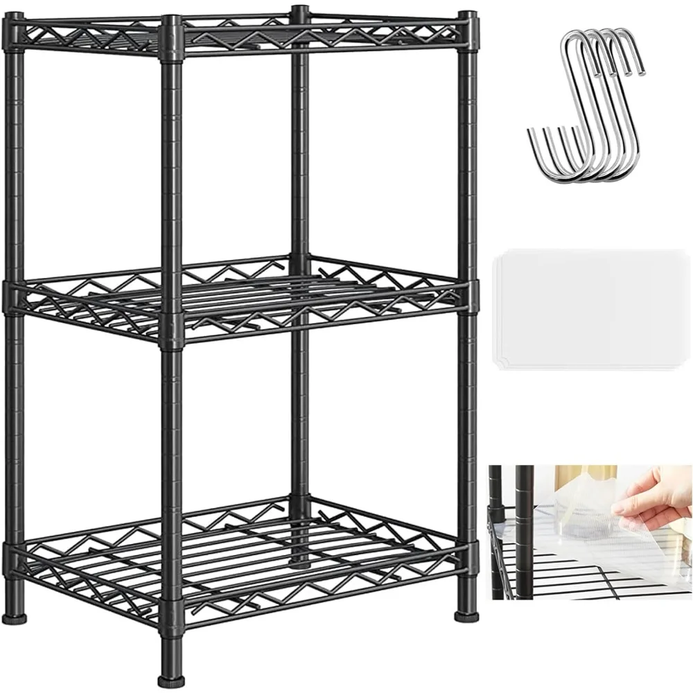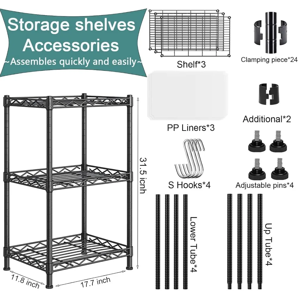 - 【Package and Instructions】 The package includes a 3-tier wire metal storage shelf, 3 pieces of shelf PP liner, and 4 hooks. Our shelves and liners are made of easy-to-clean materials. Simply wipe clean with a damp cloth, avoiding the use of harsh chemicals. Please note that the pictures provided are for illustrative purposes.